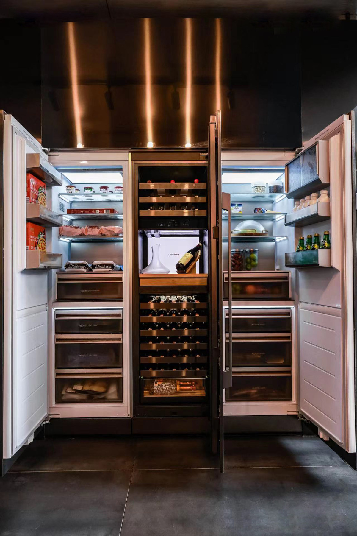 比如,打开酿酒师的冰箱,会看到赤霞珠葡萄、葡萄酒,而音乐人的冰箱里,则有雪茄、威士忌、咖啡。诗人的冰箱里除了食物,还能看到诗集、笔记本。此外,鲜花、纸牌、铜壶、文物摆件……数百件彰显高奢生活态度的物品,与卡萨帝冰箱一起出现在展区,为用户带来多重感官艺术体验。